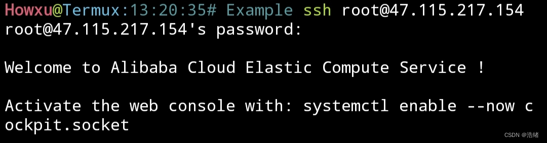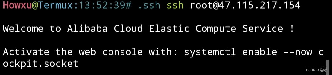 安装完成后,在服务器控制台找到需要连接的服务器的ip地址,以47.115.217.154为例,在termux中键入