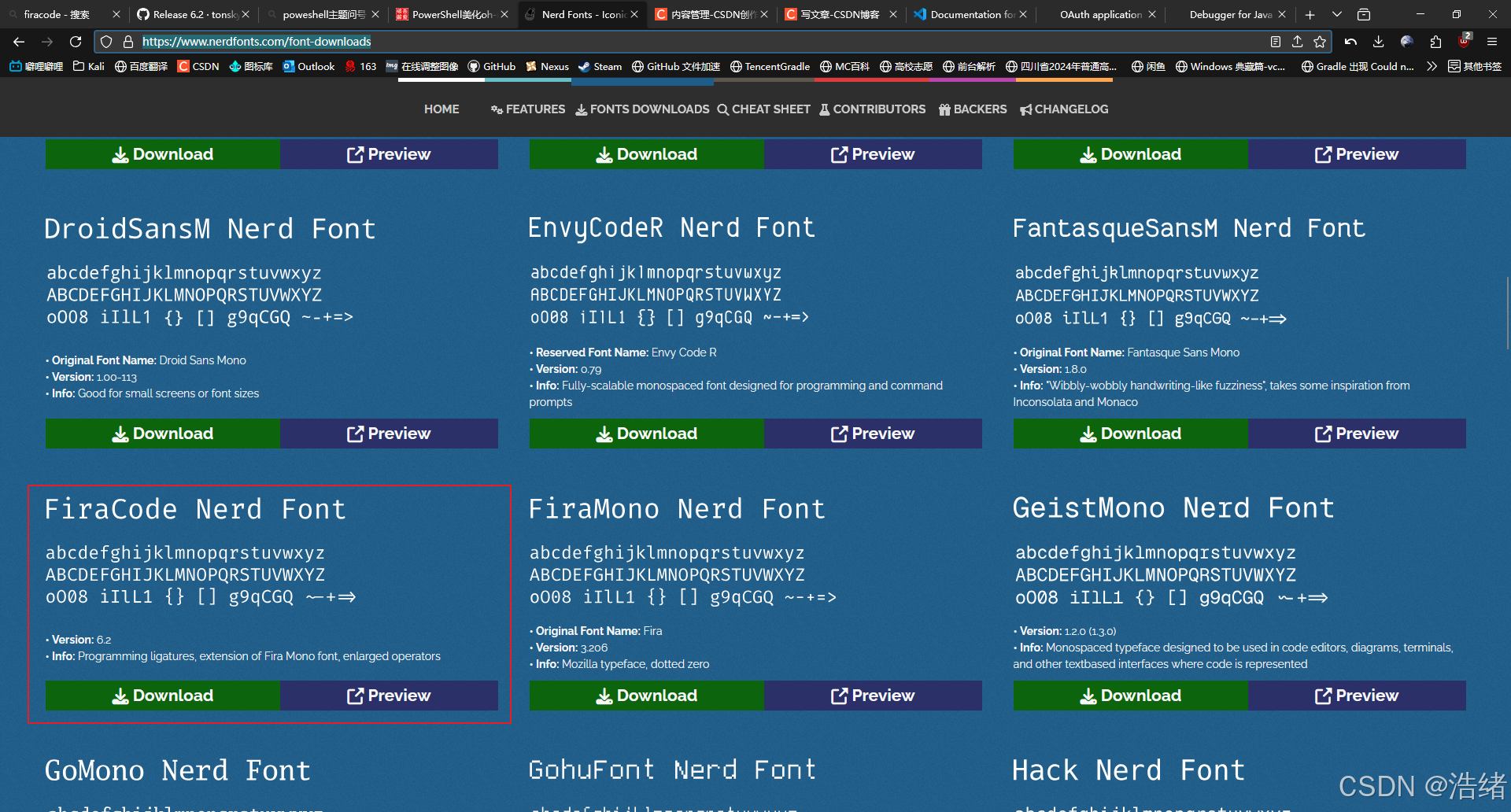 从这个链接下载一种字体文件,然后解压,全选,为所有用户安装。我个人比较喜欢Fira Code多一点。