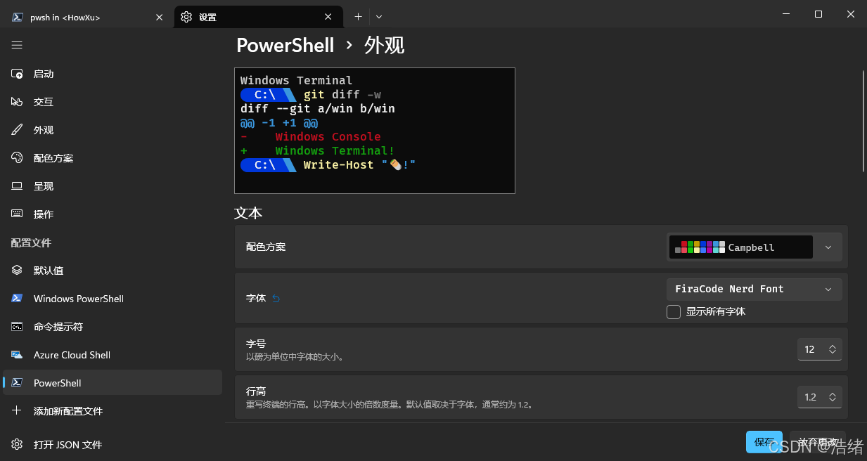 之后到终端的设置里选择PowerShell,选择外观,将字体改为Nerd Font系列的字体。不用关心前缀,后缀必须是Nerd Font。保存即可。