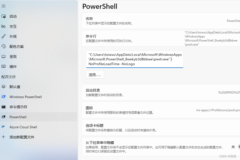 每次启动PowerShell都有提示,可以在终端->设置->PowerShell里找到命令行,然后在启动命令后面加上-NoProfileLoadTime -NoLogo参数,第一个-之前有空格。