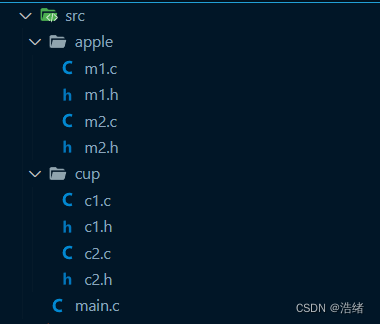 它的编译指令是gcc ./apple/m1.c ./apple/m2.c ./cup/c1.c ./cup/c2.c ./main.c - o xxxx.out。