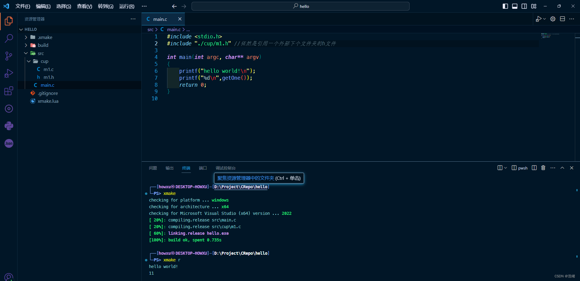 既然xmake在cmake的后面,那它肯定比cmake好用,怎么个好用呢,比如我现在,把整个hello文件夹都删了,重新来,怎么做: