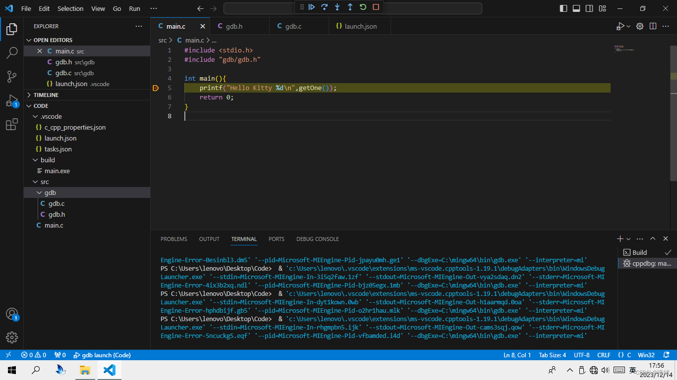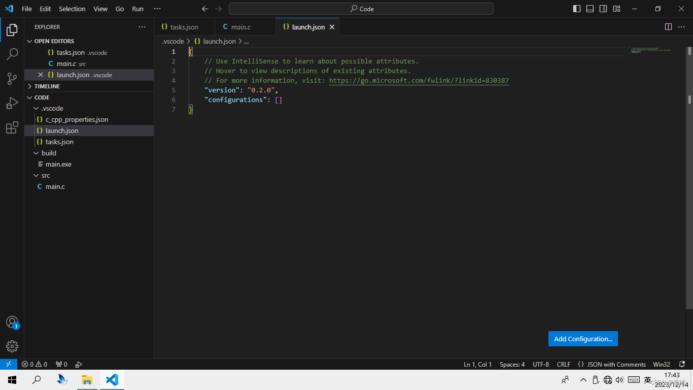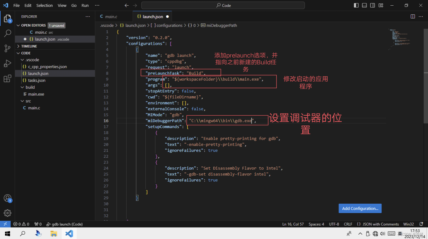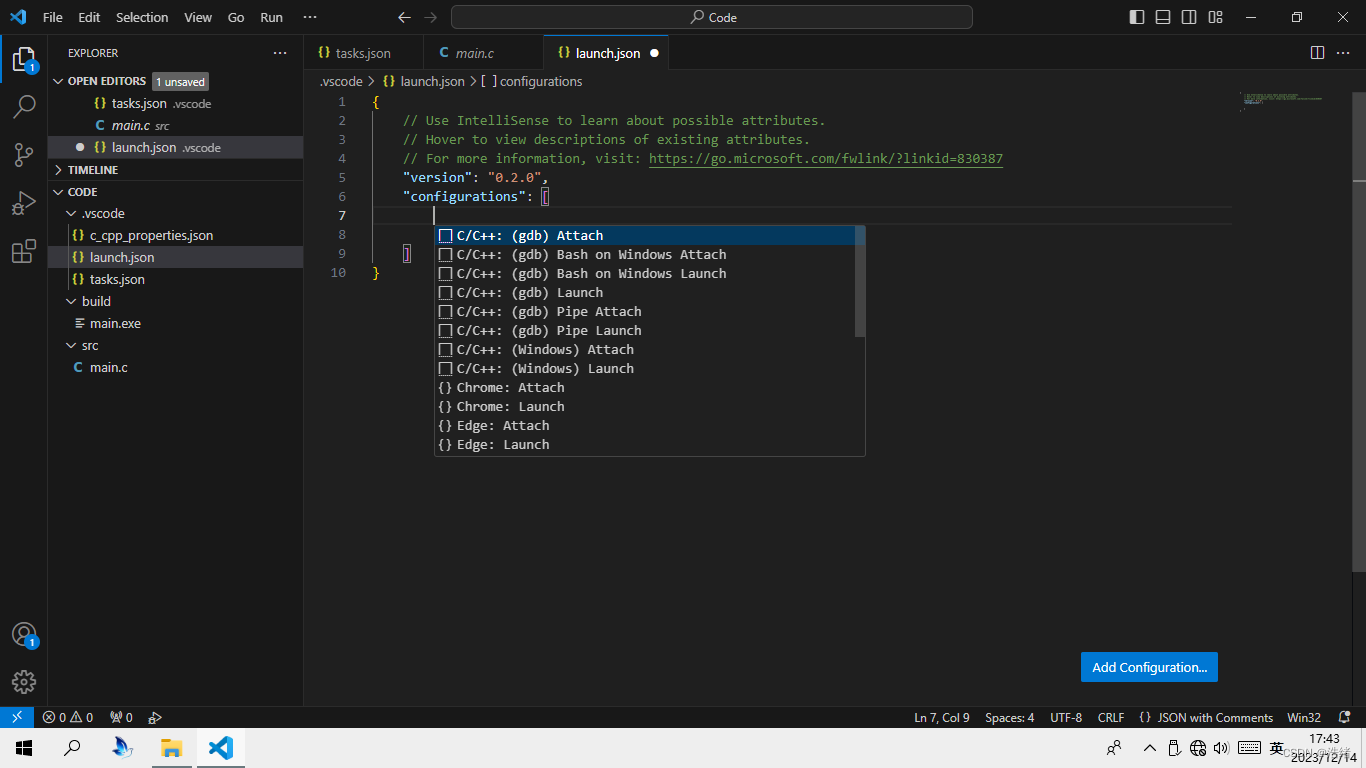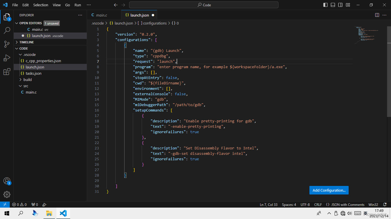 还是在main.c的编辑器页面上,依次选择运行 -> 添加配置,然后选择含gdb的选项,VSCode就会在.vscode目录下生成一个launch.json文件(但是是空的):