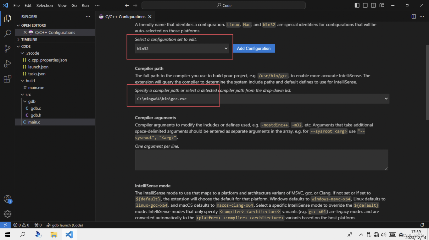 回到项目页面,按下Ctrl+Shift+P,打开C/C++编辑配置UI,然后稍微配置一下编译器什么的。这个不能省略,否则项目文件夹不会唤起C的相关配置。