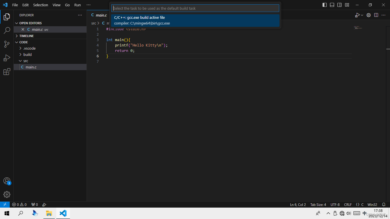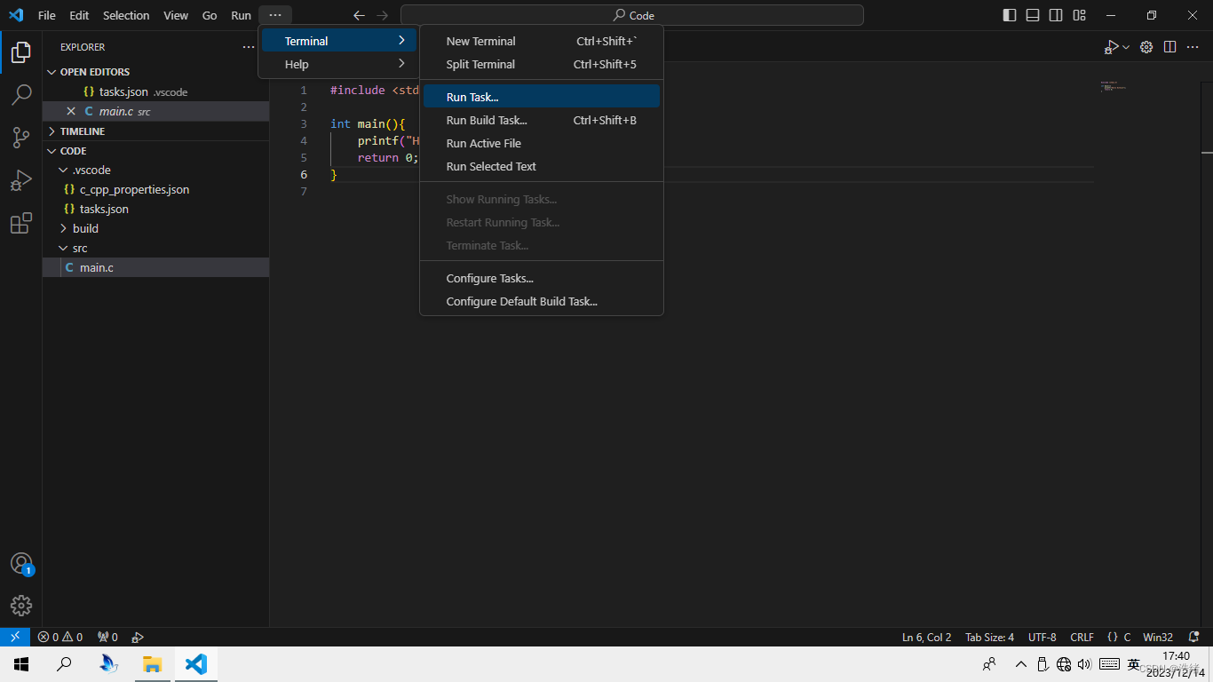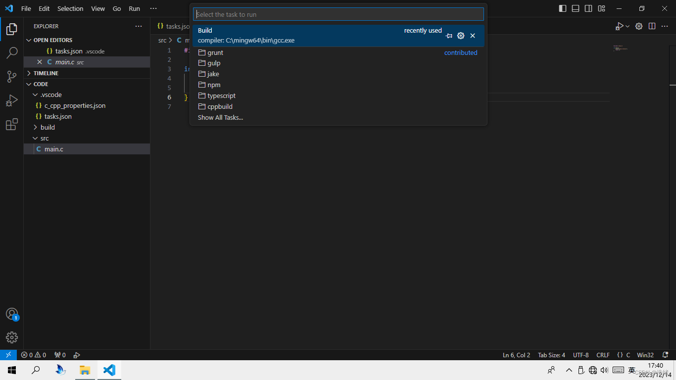 之后选择运行任务,选择运行这个配置好的生成任务,就可以实现自动构建可执行文件的操作了(也要在main.c的编辑器页面上)。