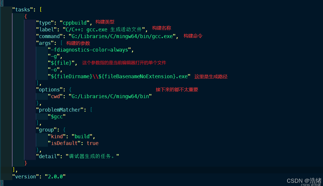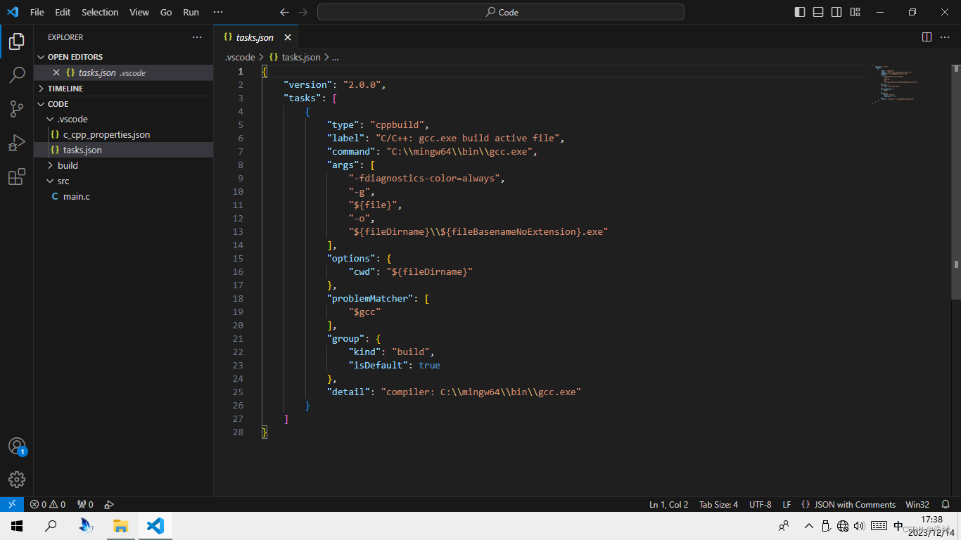 VSCode会自动生成一个tasks.json文件,内容是这样的: