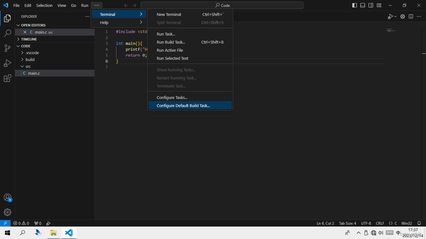 选择终端 -> 配置生成任务,就会出现配置生成任务的选项,因为我前面设置的是gcc编译器,所以这里我会选择gcc,然后选择gcc生成任务: