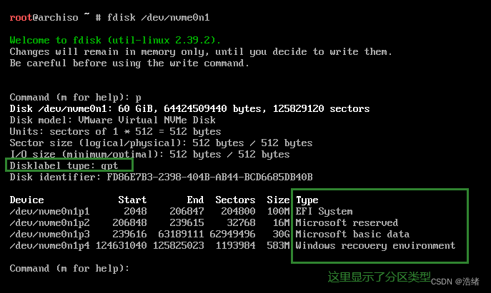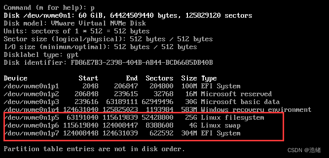 再次使用p打印分区表: