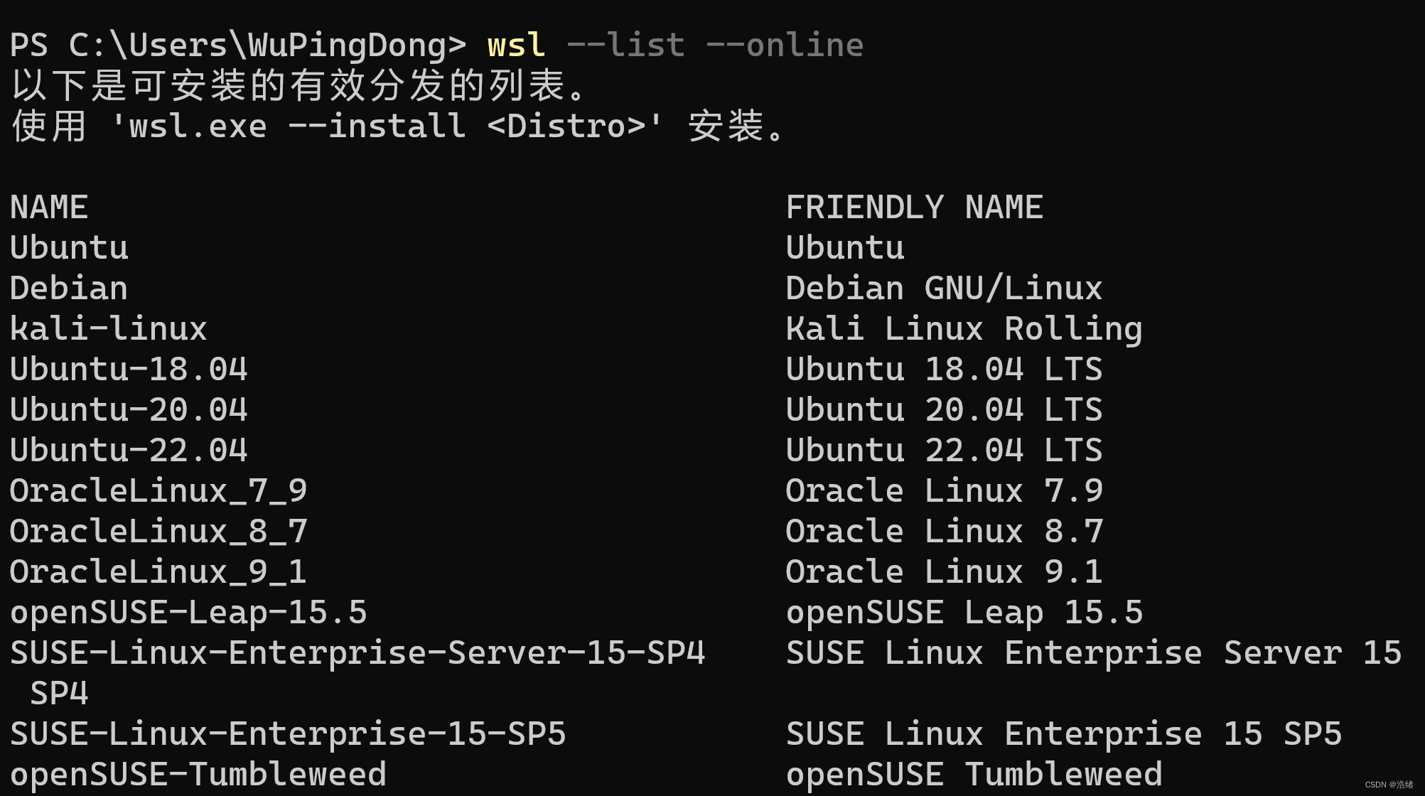 你可使用wsl --list --online获得所有的官方WSL的名称:
