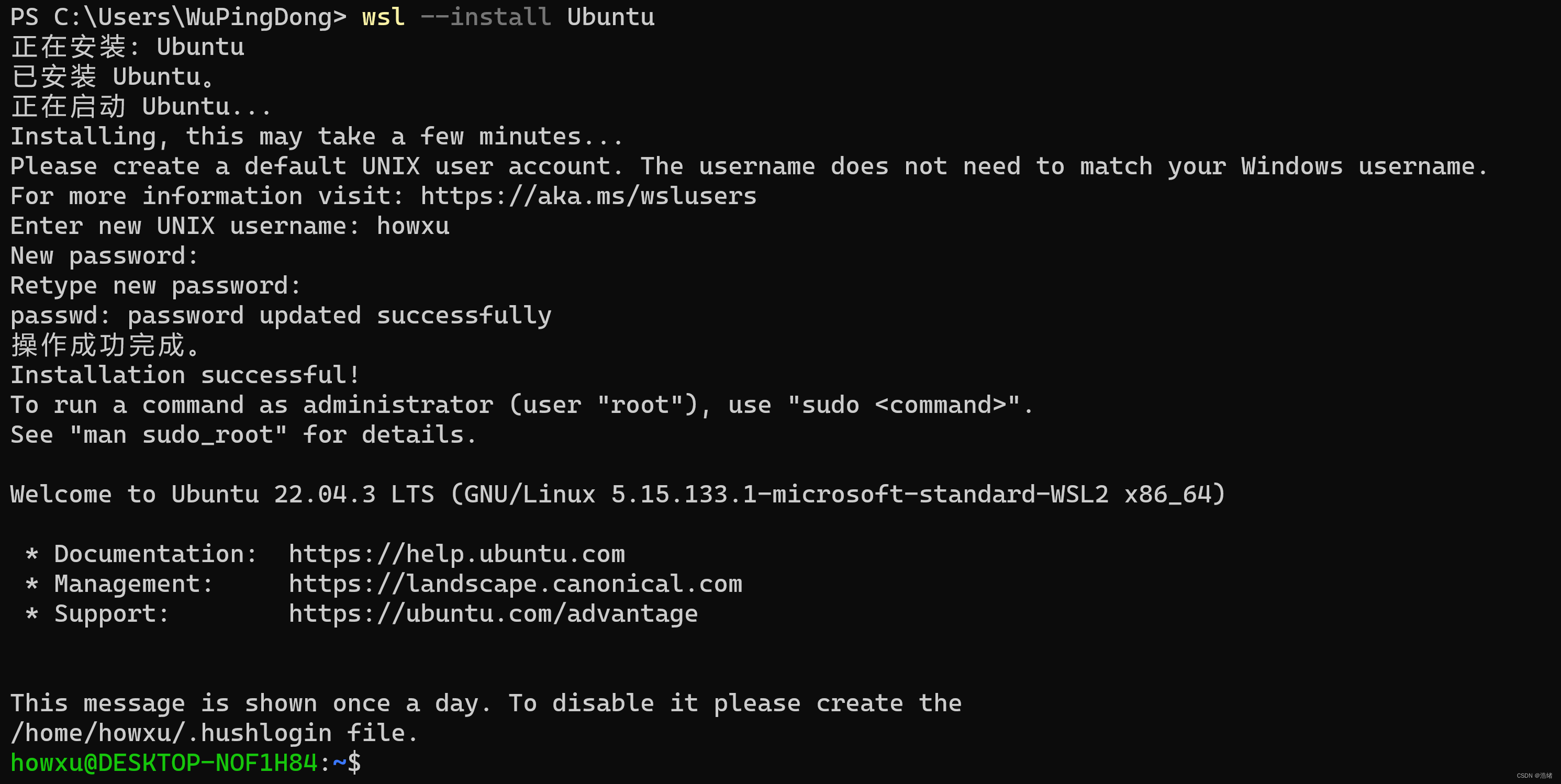 之后就可以直接用wsl登录默认WSL或者wsl -d 发行版名称登录指定的发行版。