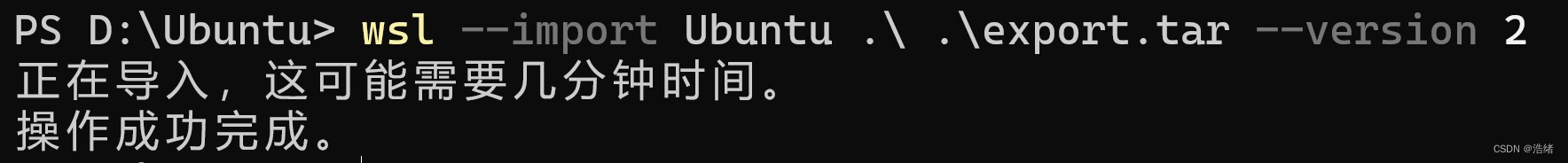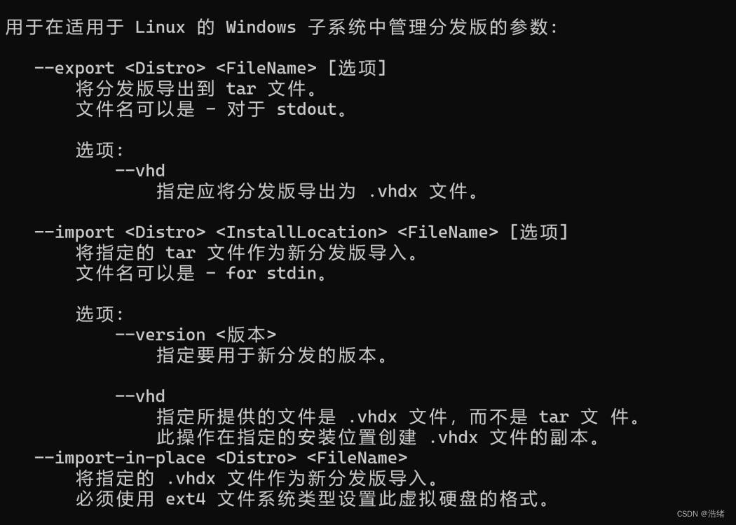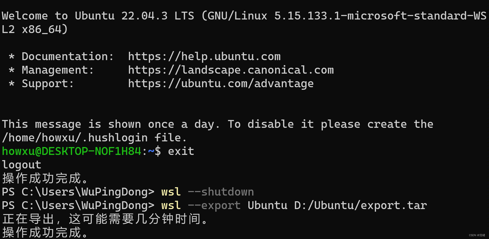 退出WSL系统,首先使用wsl --shutdown停止WSL,再使用如下命令导出: